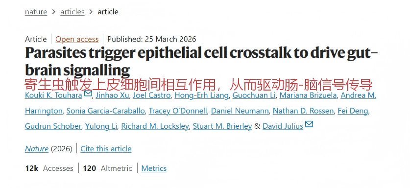 參考文獻(xiàn): Touhara, K.K., Xu, J., Castro, J. et al. Parasites trigger epithelial cell crosstalk to drive gut–brain signalling. Nature (2026).