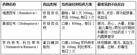 抗病毒藥物大大減少了相關(guān)并發(fā)癥和死亡率。在免疫功能正常的宿主中,病毒復(fù)制峰值發(fā)生在癥狀發(fā)作前后,并持續(xù)5~7天,這是給予抗病毒藥物的“機(jī)會窗口”。因此,在門診對感染者進(jìn)行早期、快速診斷以及及時(shí)使用口服藥物至關(guān)重要。抗病毒藥物主要靶向參與病毒生命周期或發(fā)病機(jī)制的蛋白質(zhì),包括:①依賴RNA的RNA聚合酶抑制劑;②病毒蛋白酶抑制劑。幾種已上市藥物的主要特征見表1。