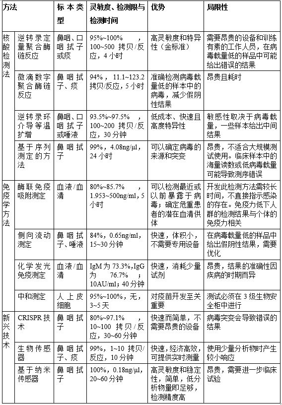 診斷方法要求簡單、快速、準(zhǔn)確、高效、價(jià)格合理,以及用戶體驗(yàn)友好。目前的診斷方法一種是核酸檢測,如逆轉(zhuǎn)錄定量聚合酶鏈反應(yīng)(RT-qPCR)和逆轉(zhuǎn)錄環(huán)介導(dǎo)等溫?cái)U(kuò)增(RT-LAMP),其中RT-qPCR因高靈敏度和特異性成為金標(biāo)準(zhǔn)。另一種基于免疫學(xué)方法,檢測患者標(biāo)本中是否存在特異性抗原或抗體,例如酶聯(lián)免疫吸附測定(ELISA)、側(cè)流測定(LFA)、化學(xué)發(fā)光免疫測定(CLIA)和中和測定。此外,基于傳感器或成簇規(guī)律間隔短回文重復(fù)(CRISPR)的方法也在不斷開發(fā)(表2)。