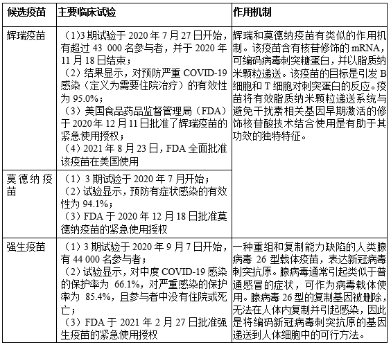 新冠疫情期間,一些醫(yī)藥公司快速反應(yīng),設(shè)計(jì)和生產(chǎn)了多種類型的新冠疫苗。盡管這些疫苗在有效性、副作用等方面存在一些問題,但在疫情防控的緊急時(shí)期起到了一定的積極作用。輝瑞公司和莫德納公司開發(fā)了編碼SARS-CoV-2刺突蛋白的mRNA疫苗,而強(qiáng)生公司則開發(fā)了基于腺病毒載體的疫苗。自美國緊急批準(zhǔn)疫苗管理以來,臨床試驗(yàn)的大量參與者及普通人群都顯示出安全性較好。臨床試驗(yàn)結(jié)果顯示,在預(yù)防重度和有癥狀新冠病毒感染方面,輝瑞和莫德納疫苗有效性分別為95%和94.1%,強(qiáng)生疫苗的有效性為85.4%。我國也有滅活疫苗、腺病毒載體疫苗、亞單位疫苗等多款新冠疫苗上市,起到較好的保護(hù)作用。表3對比了幾種較早上市的國外疫苗的臨床試驗(yàn)結(jié)果及作用機(jī)制。