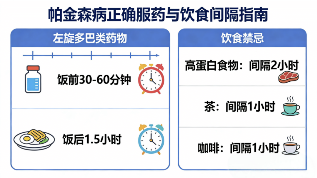 (1)左旋多巴類藥物:飯前30–60分鐘或飯后1.5小時(shí)服,避開高蛋白、茶、咖啡,緩釋片不掰不嚼。