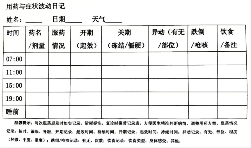 4.觀察記錄:記錄服藥及癥狀變化,發(fā)現(xiàn)異動(dòng)加重、頻繁凍結(jié)、幻覺等及時(shí)復(fù)診。