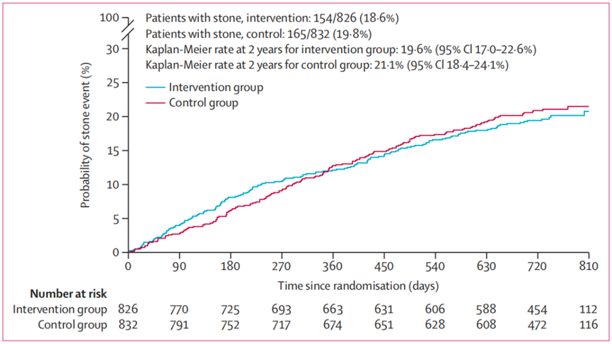 但最關(guān)鍵的核心結(jié)果,卻打破了傳統(tǒng)認(rèn)知:干預(yù)組癥狀性結(jié)石復(fù)發(fā)率為18.6%(154人),對照組19.8%(165人),兩組無統(tǒng)計學(xué)差異。簡單來說,就算成功讓患者多喝了水、尿量變多,但結(jié)石復(fù)發(fā)的概率并沒有降低。
